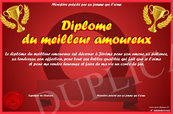 Envoyez par email votre Diplôme du meilleur amoureux personalisé