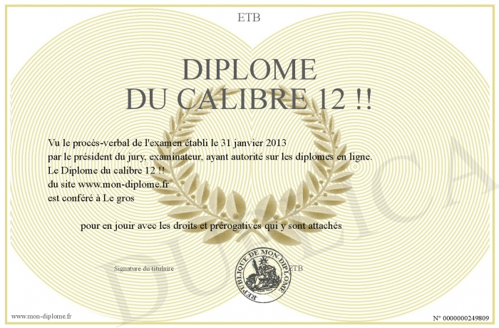 Envoyez par email votre Diplôme du calibre 12 !! personalisé