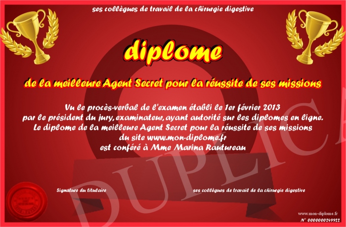 Envoyez par email votre diplôme de la meilleure Agent Secret pour la réussite de ses missions personalisé