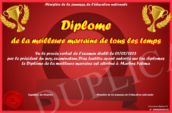 Envoyez par email votre Diplôme de la meilleure marraine de tous les temps personalisé