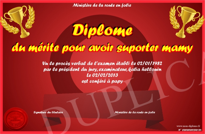 Envoyez par email votre Diplôme du mérite pour avoir suporter mamy personalisé