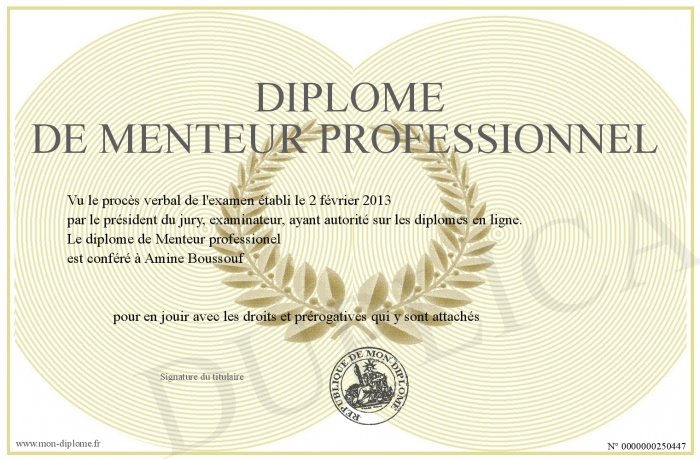 Envoyez par email votre Diplôme de menteur professionnel personalisé