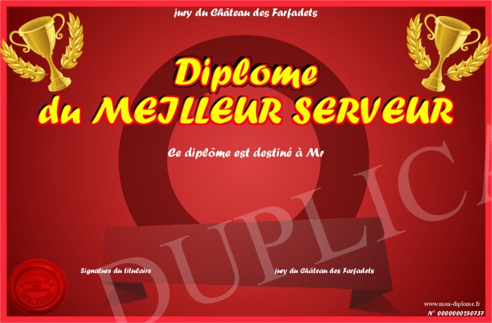 Envoyez par email votre Diplôme du MEILLEUR SERVEUR personalisé