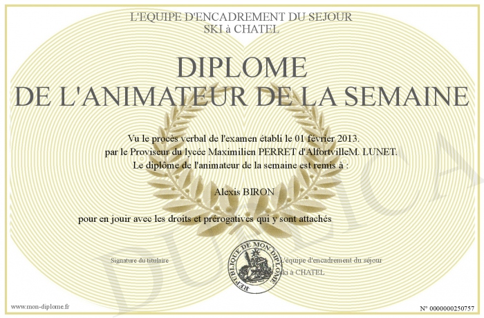 Envoyez par email votre Diplôme de l'Animateur de la semaine personalisé