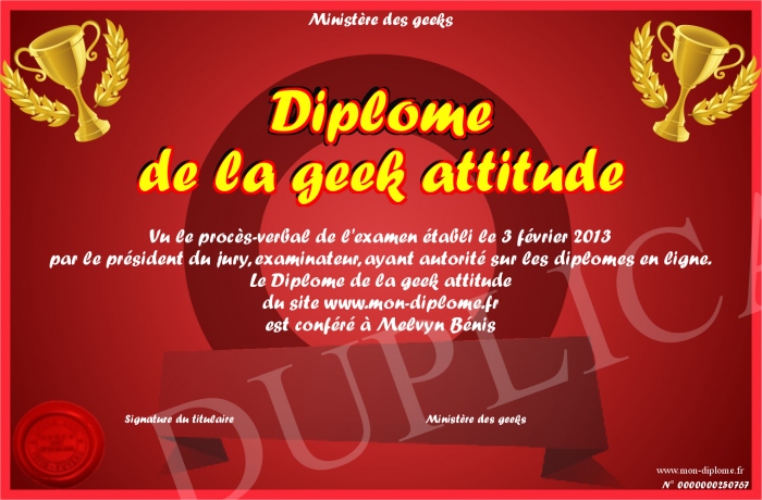 Envoyez par email votre Diplôme de la geek attitude personalisé