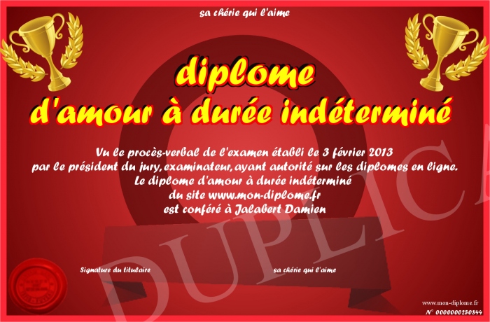 Envoyez par email votre diplôme d'amour à durée indéterminé personalisé