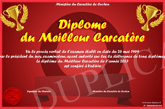 Envoyez par email votre Diplôme du Meilleur Carcatère personalisé