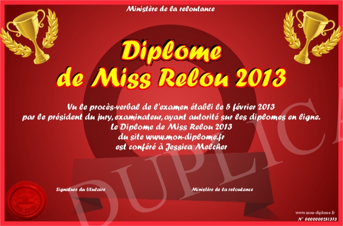Envoyez par email votre Diplôme de Miss Relou 2013 personalisé