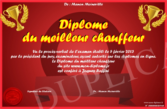 Envoyez par email votre Diplôme du meilleur chauffeur personalisé