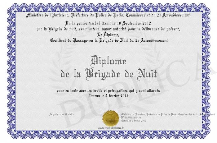 Envoyez par email votre Diplome de la Brigade de Nuit personalisé