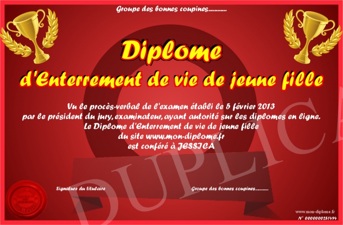 Envoyez par email votre Diplôme d'Enterrement de vie de jeune fille personalisé