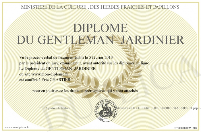 Envoyez par email votre Diplôme du GENTLEMAN JARDINIER personalisé