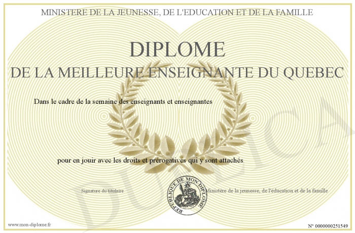 Envoyez par email votre Diplôme de la meilleure enseignante du Québec personalisé