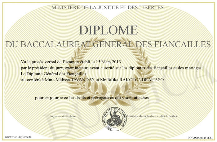 Envoyez par email votre Diplôme du Baccalaureat Général des fiancailles personalisé