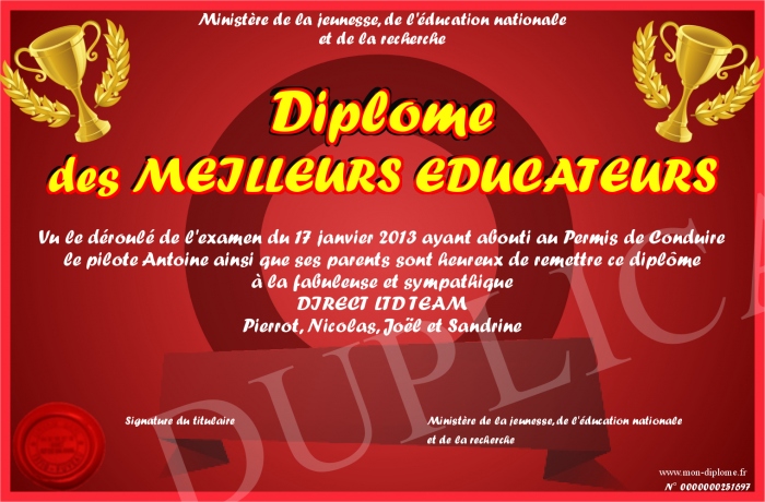 Envoyez par email votre Diplôme des MEILLEURS EDUCATEURS personalisé