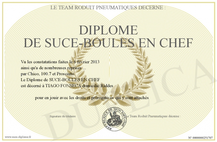 Envoyez par email votre Diplôme de SUCE-BOULES EN CHEF personalisé