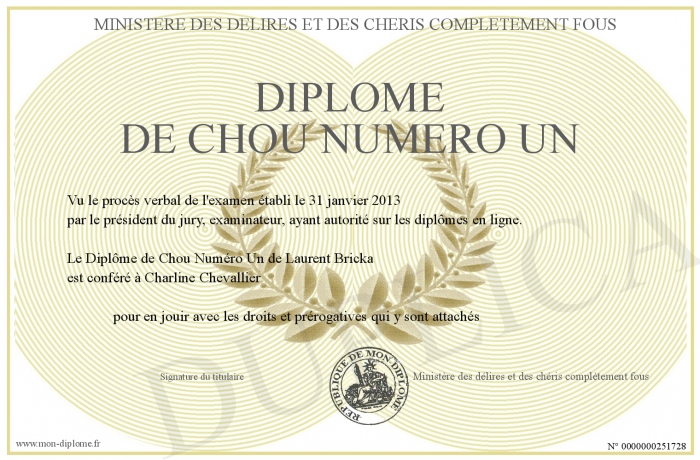 Envoyez par email votre Diplôme de Chou Numéro Un personalisé