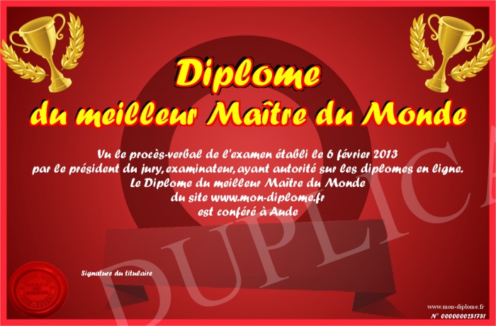 Envoyez par email votre Diplôme du meilleur Maître du Monde personalisé