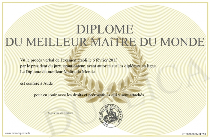 Envoyez par email votre Diplôme du meilleur Maître du Monde personalisé