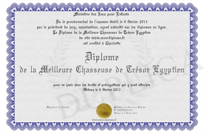 Envoyez par email votre Diplôme de la Meilleure Chasseuse de Trésor Egyptien personalisé