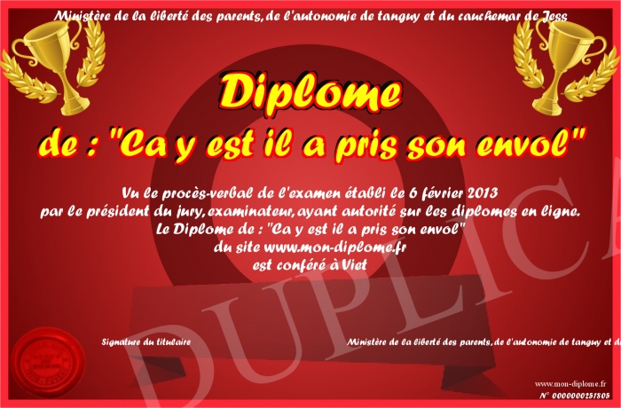 Envoyez par email votre Diplôme de : -Ca y est il a pris son envol- personalisé