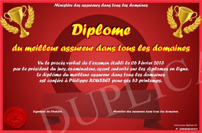 Envoyez par email votre Diplome du meilleur assureur dans tous les domaines personalisé