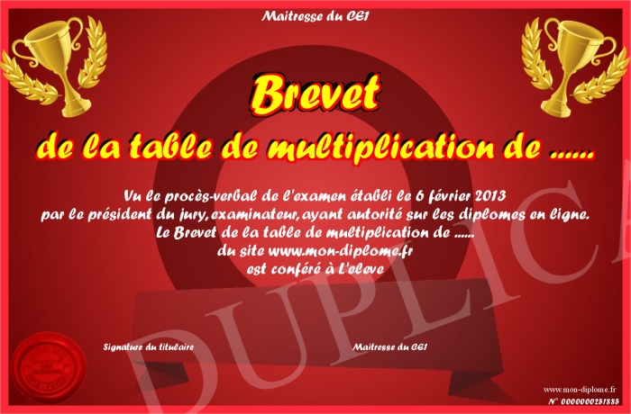 Envoyez par email votre Brevet de la table de multiplication de ...... personalisé