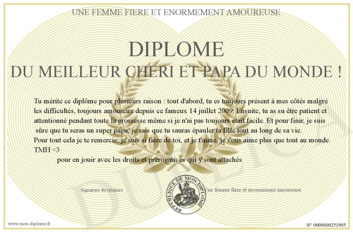 Envoyez par email votre Diplôme du Meilleur Chéri et Papa du monde ! personalisé