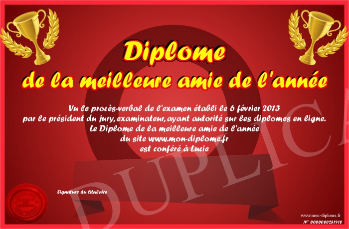 Envoyez par email votre Diplome de la meilleure amie de l'année personalisé
