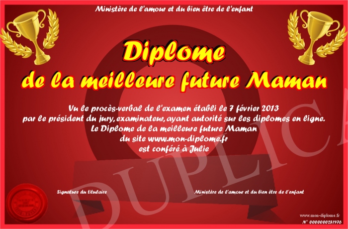 Envoyez par email votre Diplôme de la meilleure future Maman personalisé