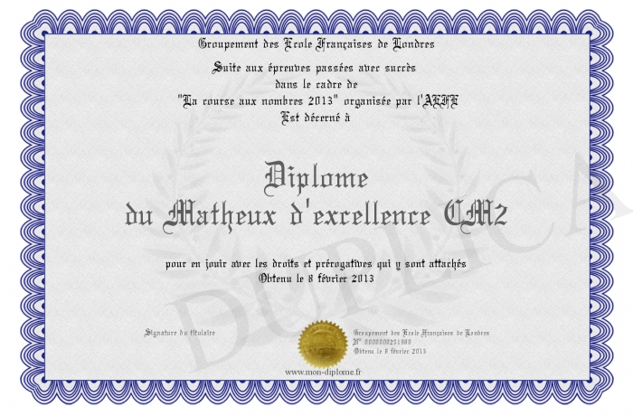 Envoyez par email votre Diplôme du Matheux d'excellence CM2 personalisé
