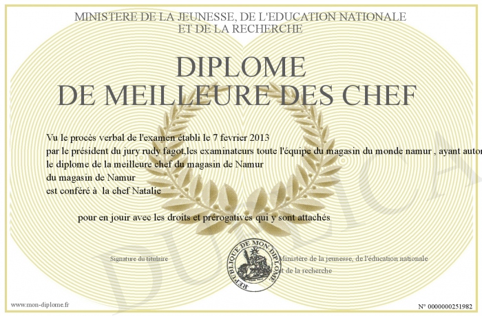 Envoyez par email votre Diplôme de meilleure des chef personalisé