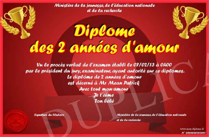 Envoyez par email votre Diplôme des 2 années d'amour personalisé