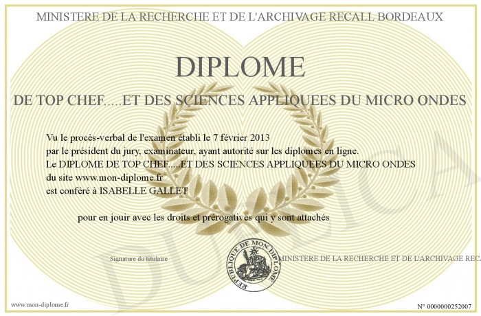 Envoyez par email votre DIPLOME DE TOP CHEF.....ET DES SCIENCES APPLIQUEES DU MICRO ONDES personalisé