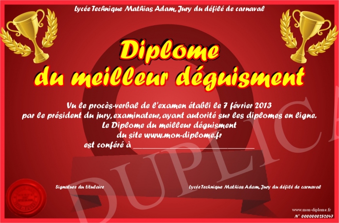 Envoyez par email votre Diplôme du meilleur déguisment personalisé