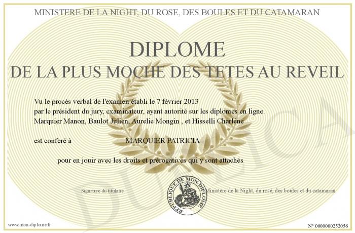 Envoyez par email votre DIPLOME DE LA PLUS MOCHE DES TETES AU REVEIL personalisé