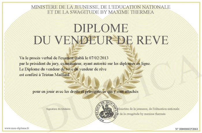 Envoyez par email votre Diplôme du vendeur de reve personalisé