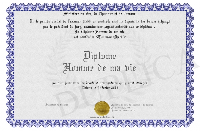 Envoyez par email votre Diplome Homme de ma vie personalisé