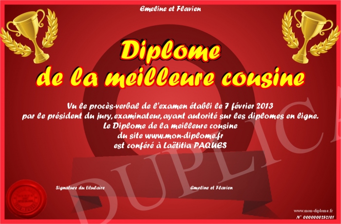 Envoyez par email votre Diplome de la meilleure cousine personalisé