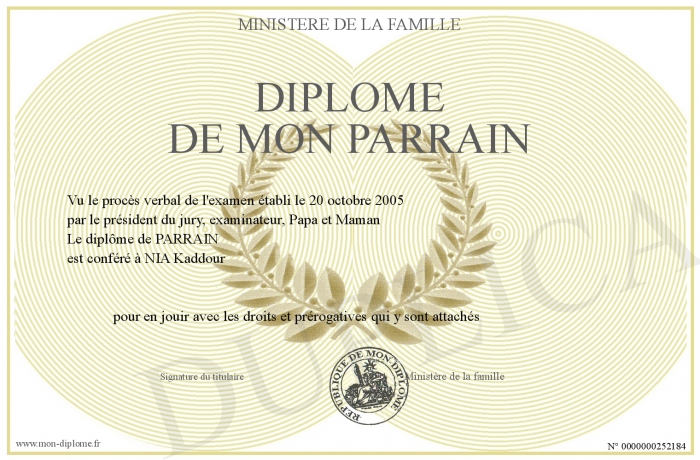 Envoyez par email votre Diplôme de mon parrain personalisé