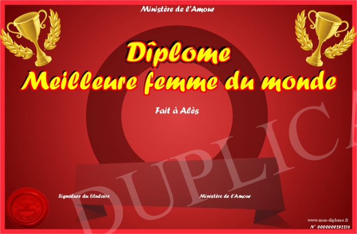 Envoyez par email votre Dîplome Meilleure femme du monde personalisé