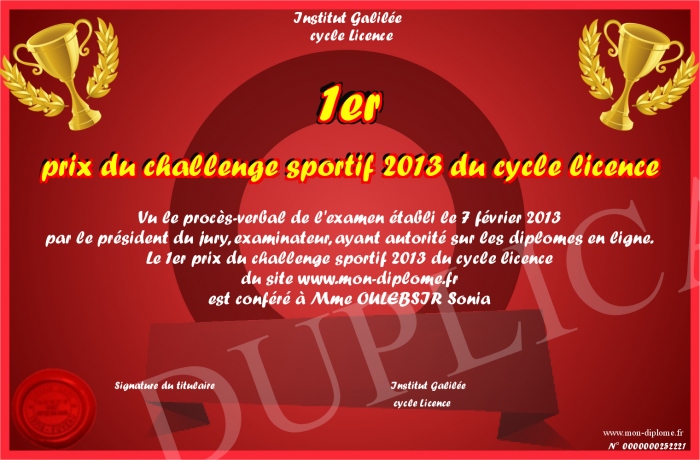 Envoyez par email votre 1er prix du challenge sportif 2013 du cycle licence personalisé