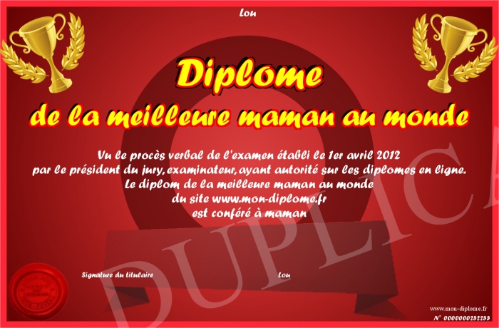 Envoyez par email votre Diplôme de la meilleure maman au monde personalisé