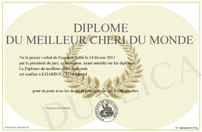 Envoyez par email votre Diplôme du meilleur chéri du monde personalisé