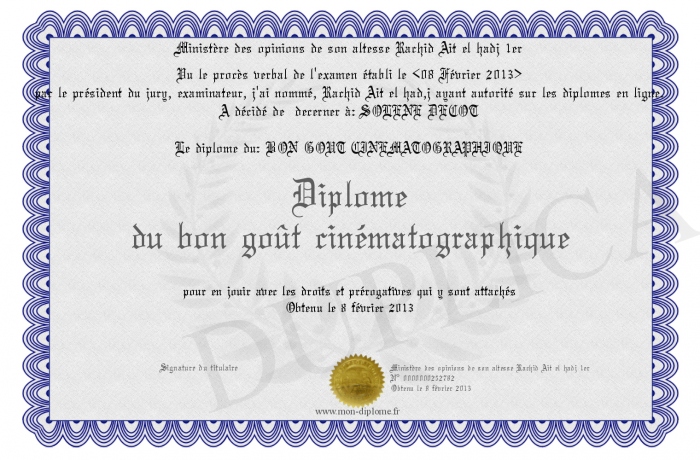 Envoyez par email votre Diplome du bon goût cinématographique personalisé