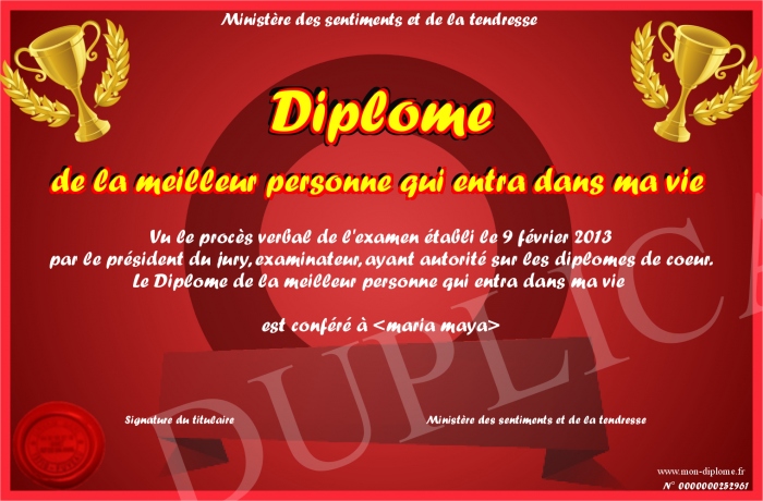 Envoyez par email votre Diplôme de la meilleur personne qui entra dans ma vie personalisé