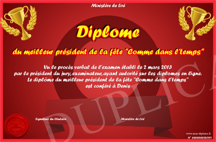 Envoyez par email votre Diplôme du meilleur président de la fête -Comme dans l'temps- personalisé