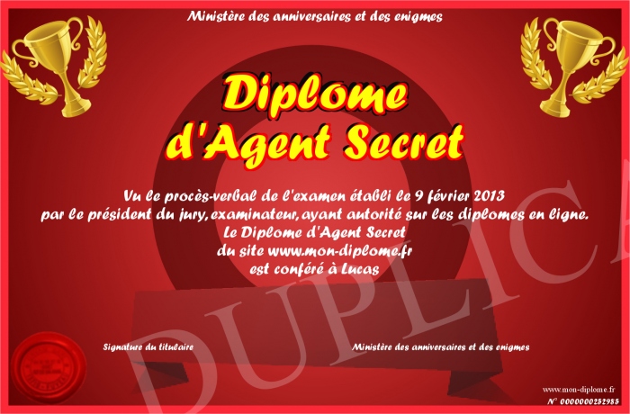 Envoyez par email votre Diplôme d'Agent Secret personalisé