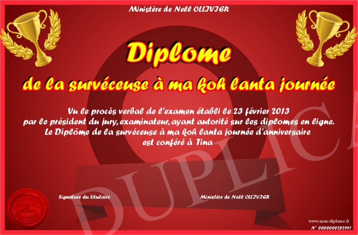 Envoyez par email votre Diplôme de la survéceuse à ma koh lanta journée personalisé