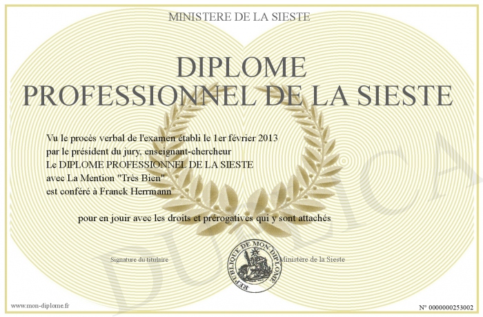 Envoyez par email votre DIPLOME PROFESSIONNEL DE LA SIESTE personalisé
